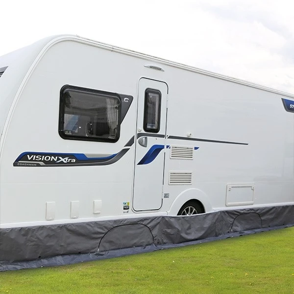 The draught skirt features standard caravan channel beading across the top of the draft skirt enabling it to be threaded into a standard caravan channel. The fabric is a premium dual layered fabric with a weather proof, easy clean PVC backing and a soift touch ‘cotton style’ front giving you the best of both worlds. It has eyelets across the bottom allowing it to be pegging securely into the ground giving an even better protection against draughts. The draught skirt also comes with its own handy storage bag making it easier to carry and store away when not in use.