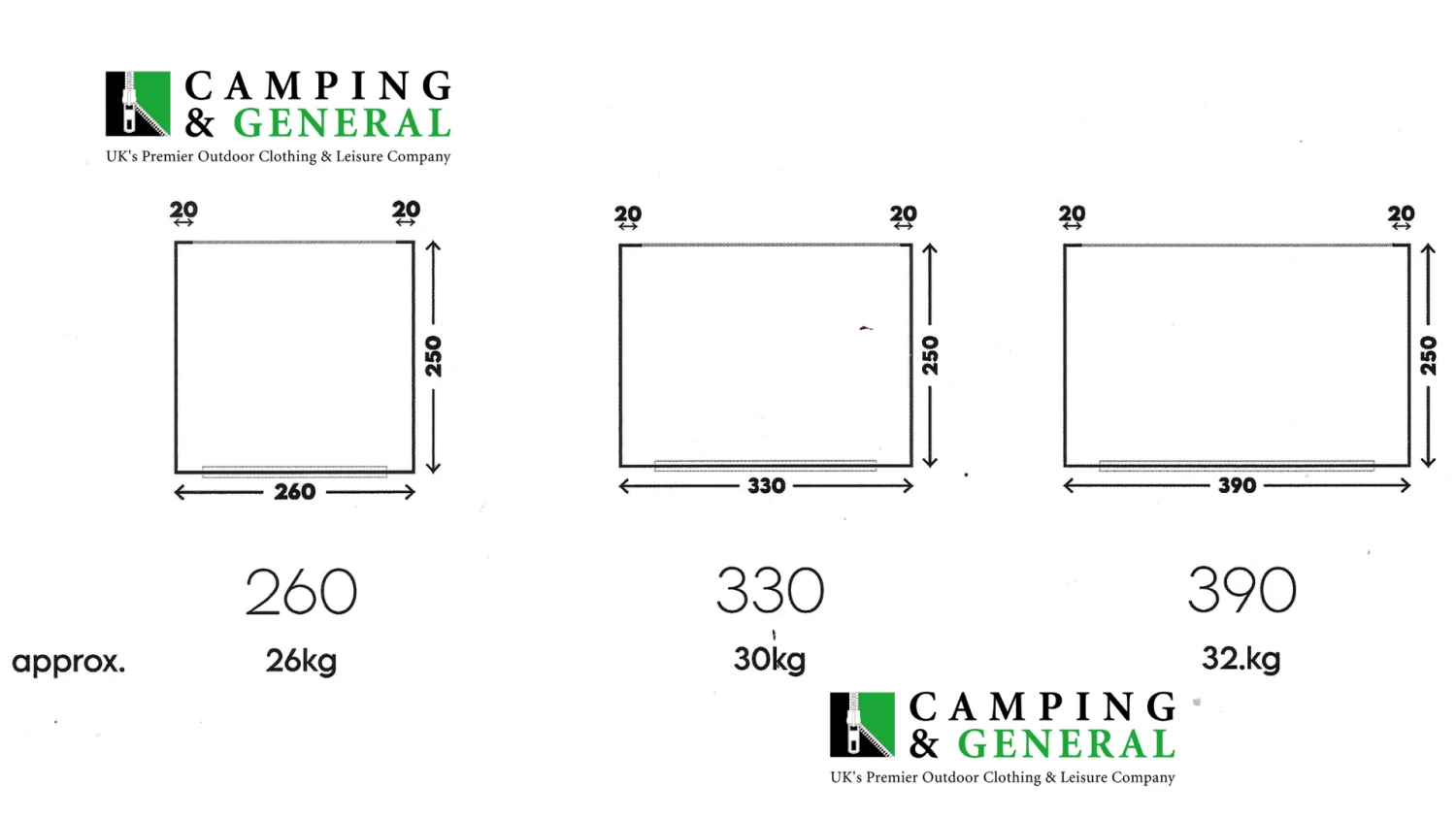 Complete with Pump, draught skirt, curtains, compression carry bag & peg pack
